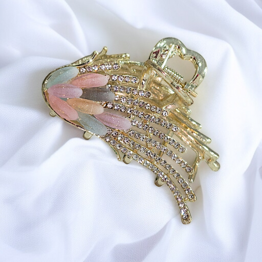 Glimmerfly is a set of 2 elegant hair clips featuring shimmering iridescent and blue crystals....