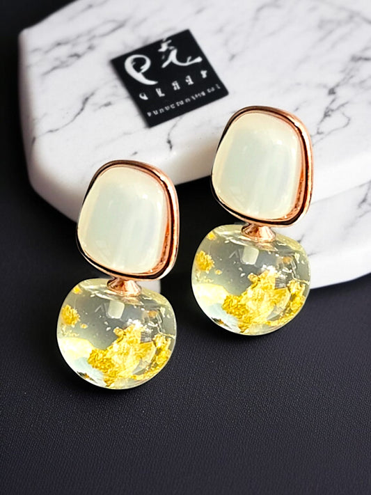 These earrings feature a square, iridescent white stone or material, possibly mother-of-pearl or a similar...