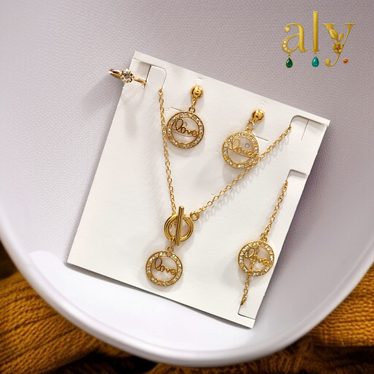 LoveLuxe is a 4-piece golden jewelry set featuring a toggle clasp necklace, earrings, bracelet, and...