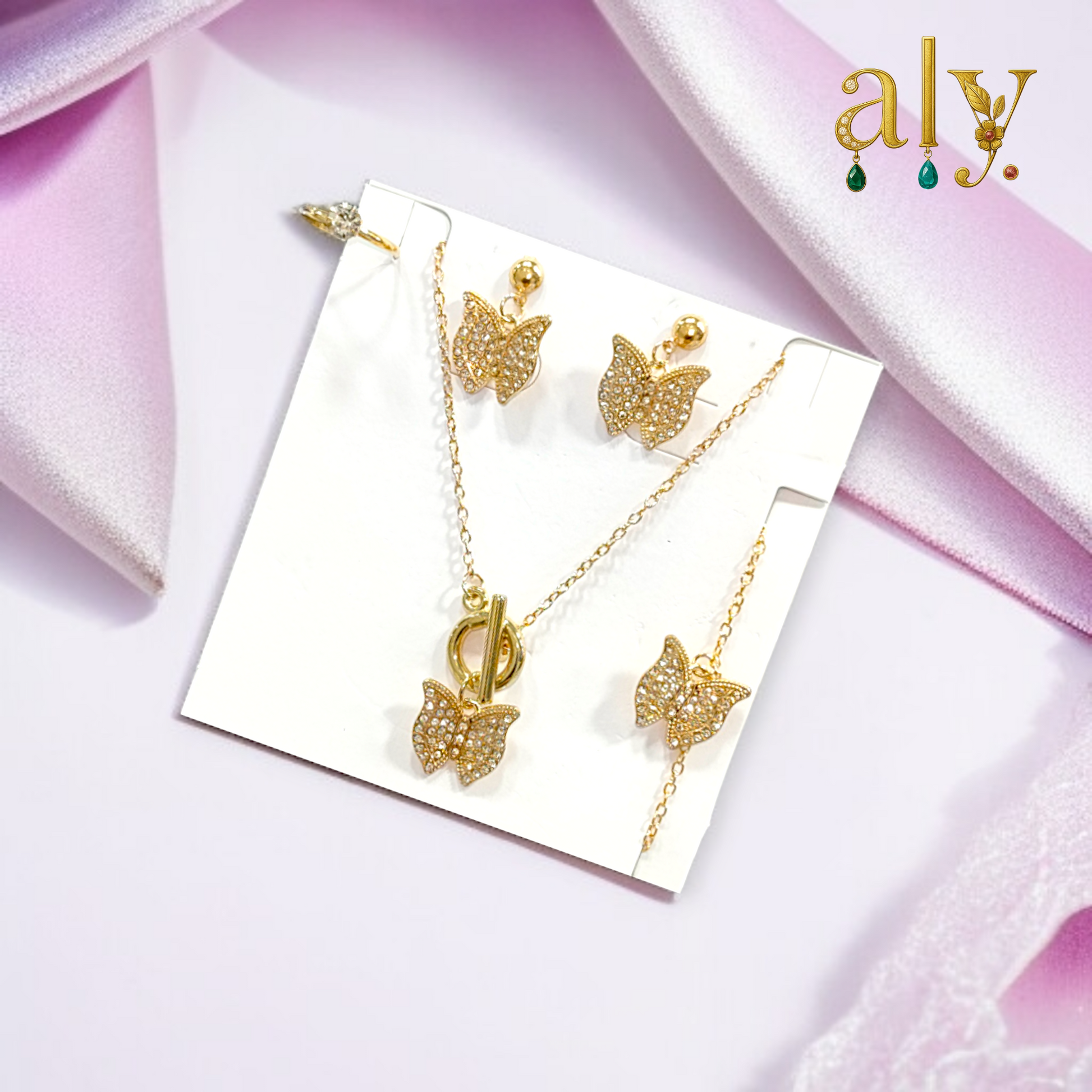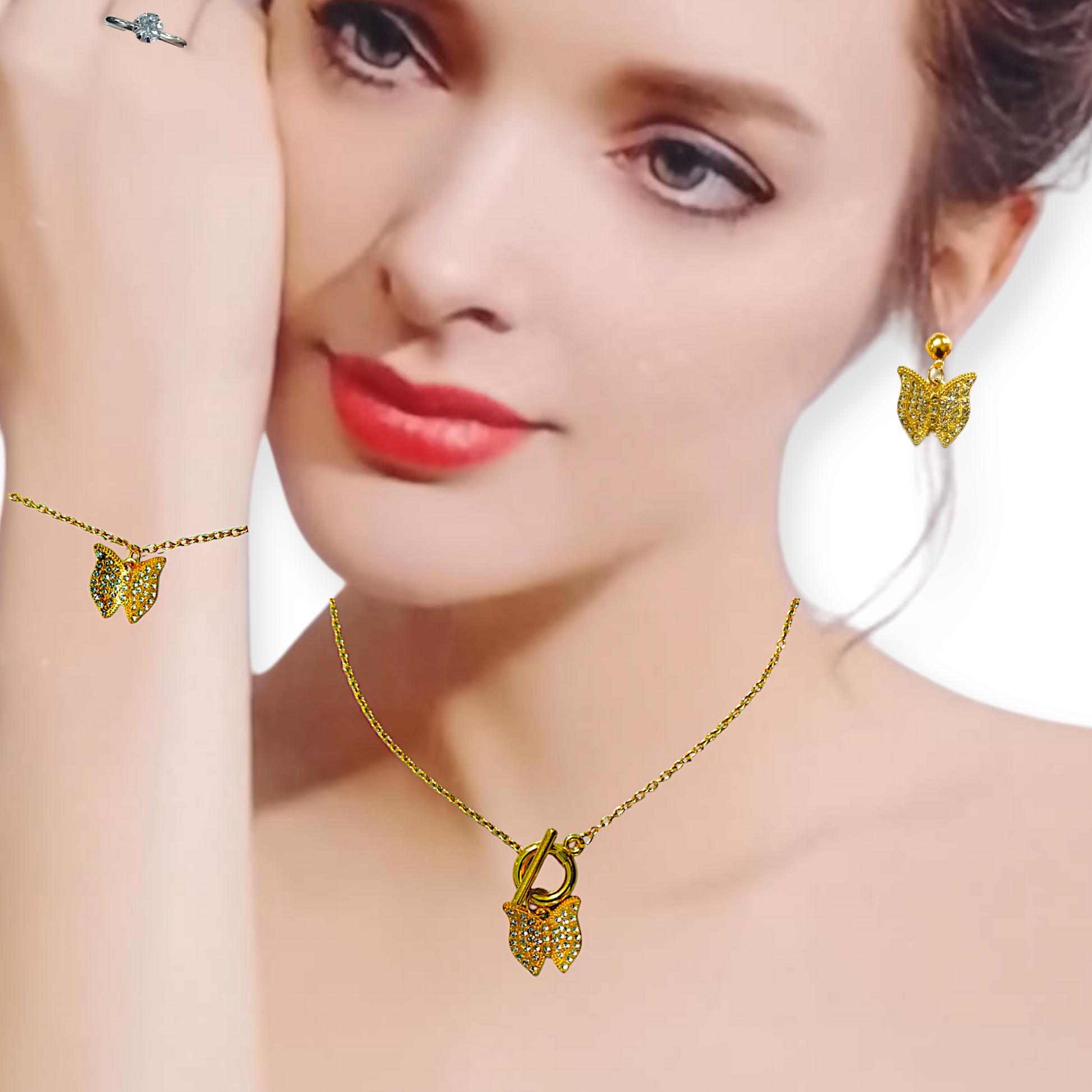 Aurafly is a golden 4-piece butterfly jewelry set featuring earrings, a bracelet, a ring, and 2 necklaces—one with a chic toggle clasp. Delicate, stylish, and perfect for everyday elegance or special occasions .