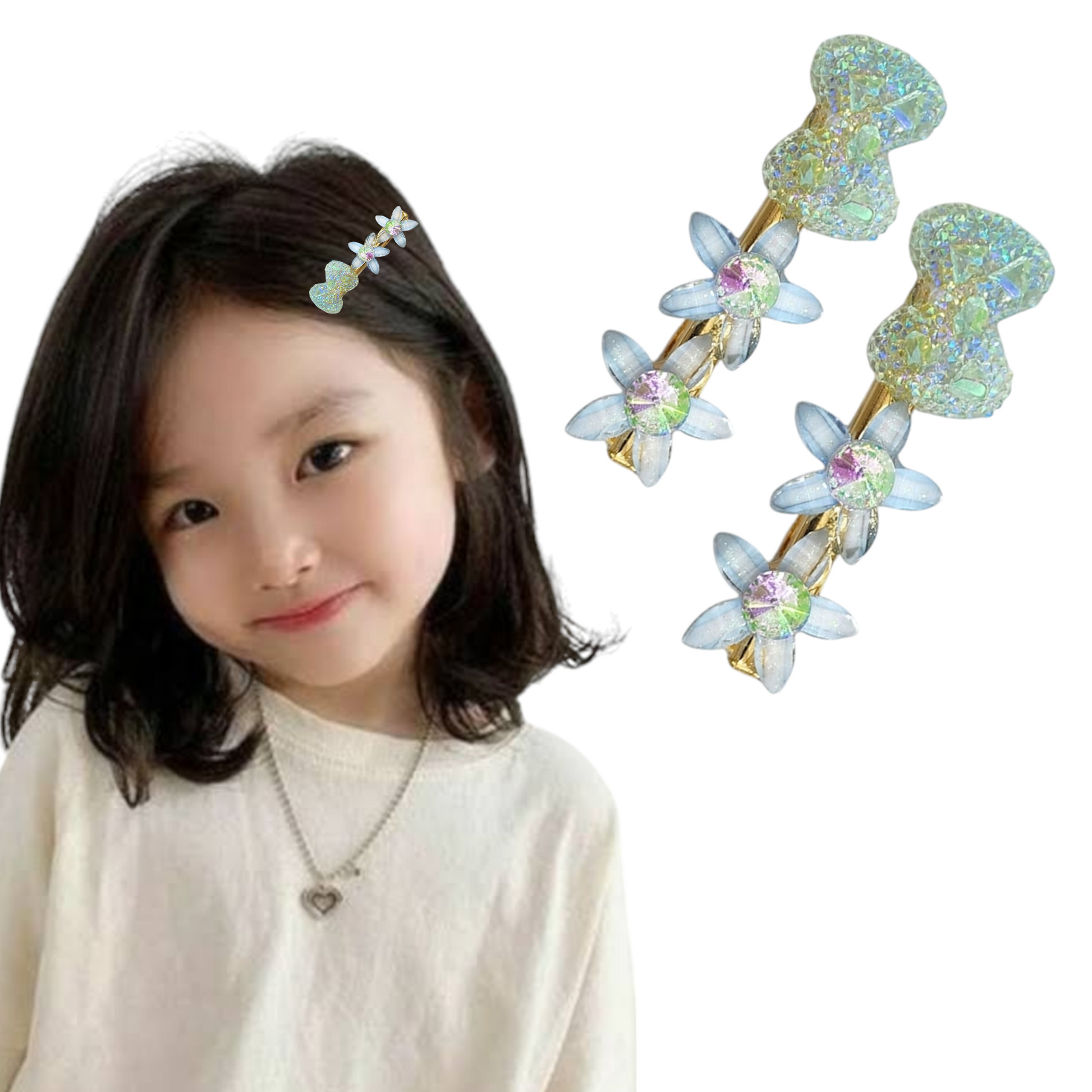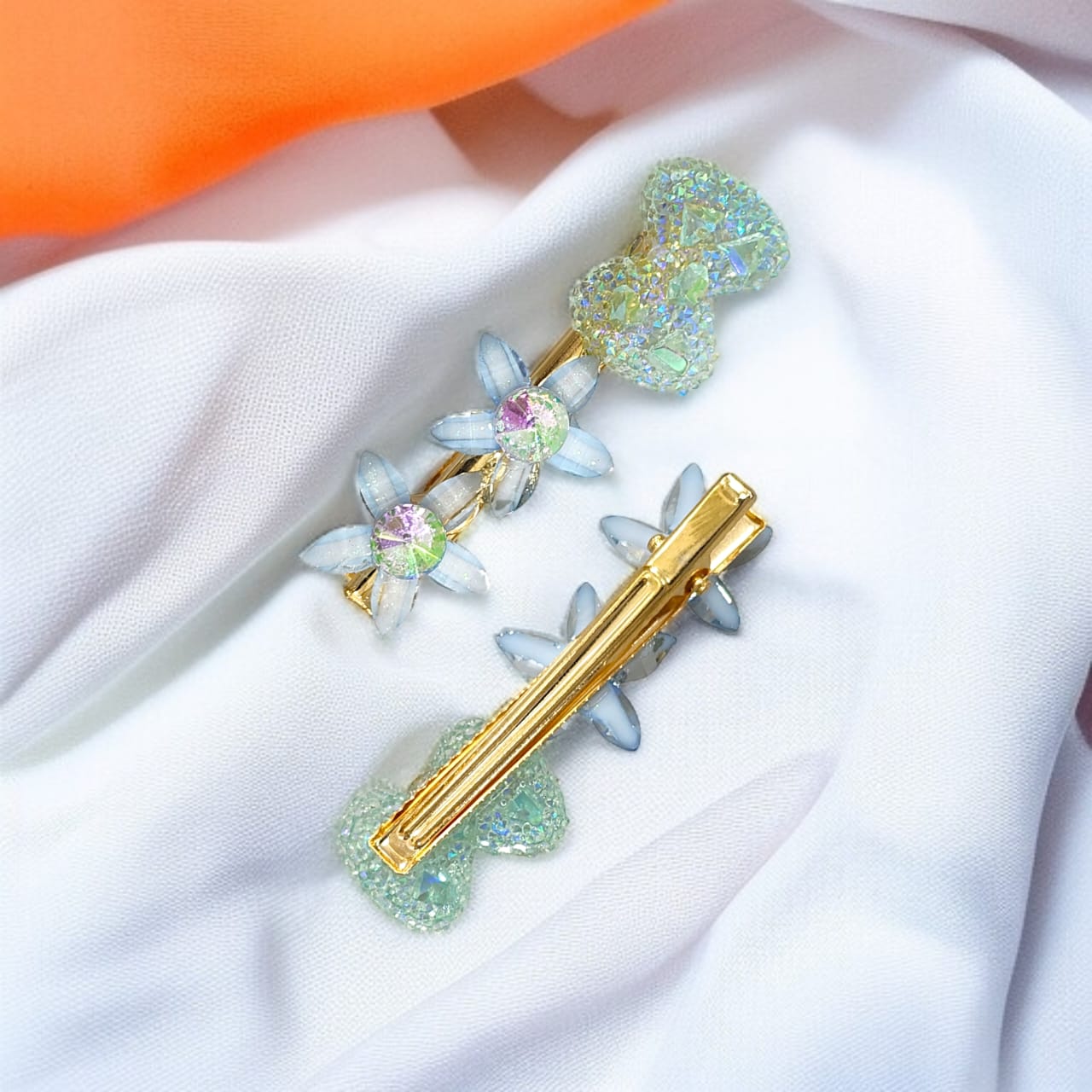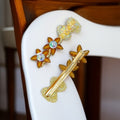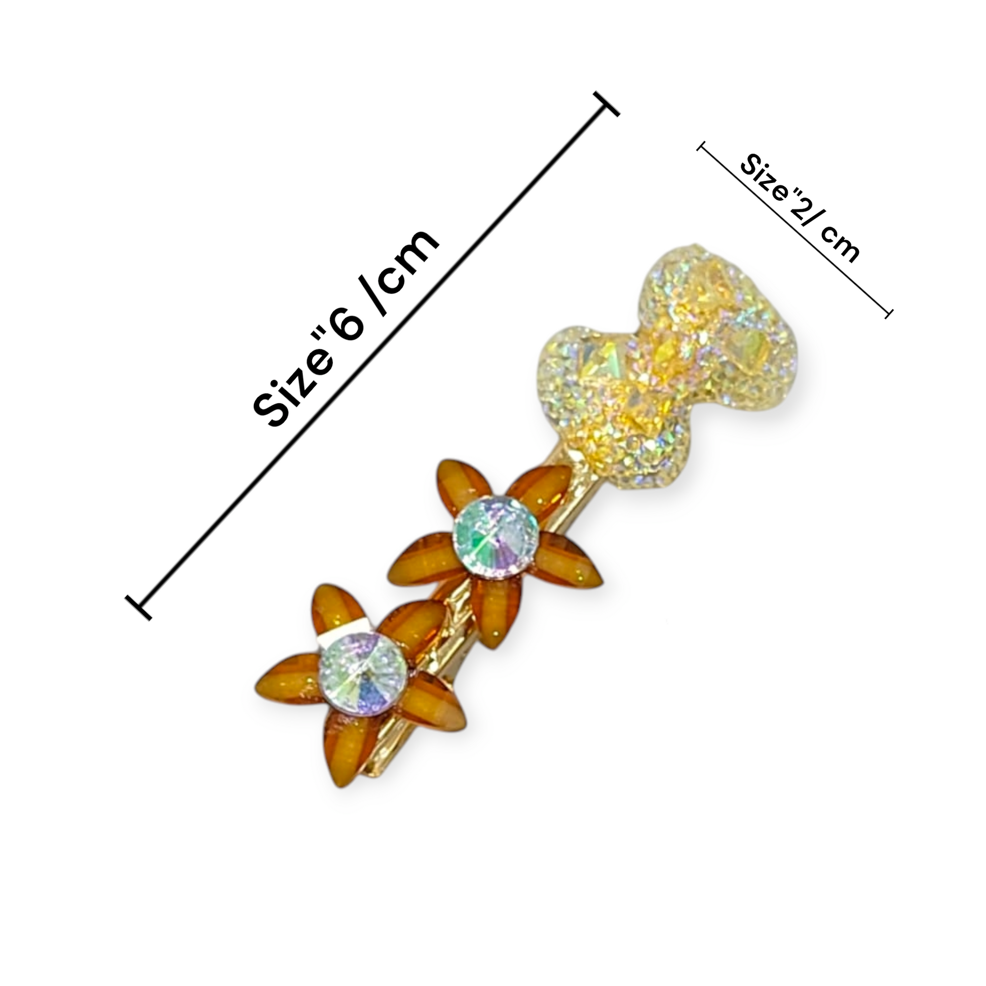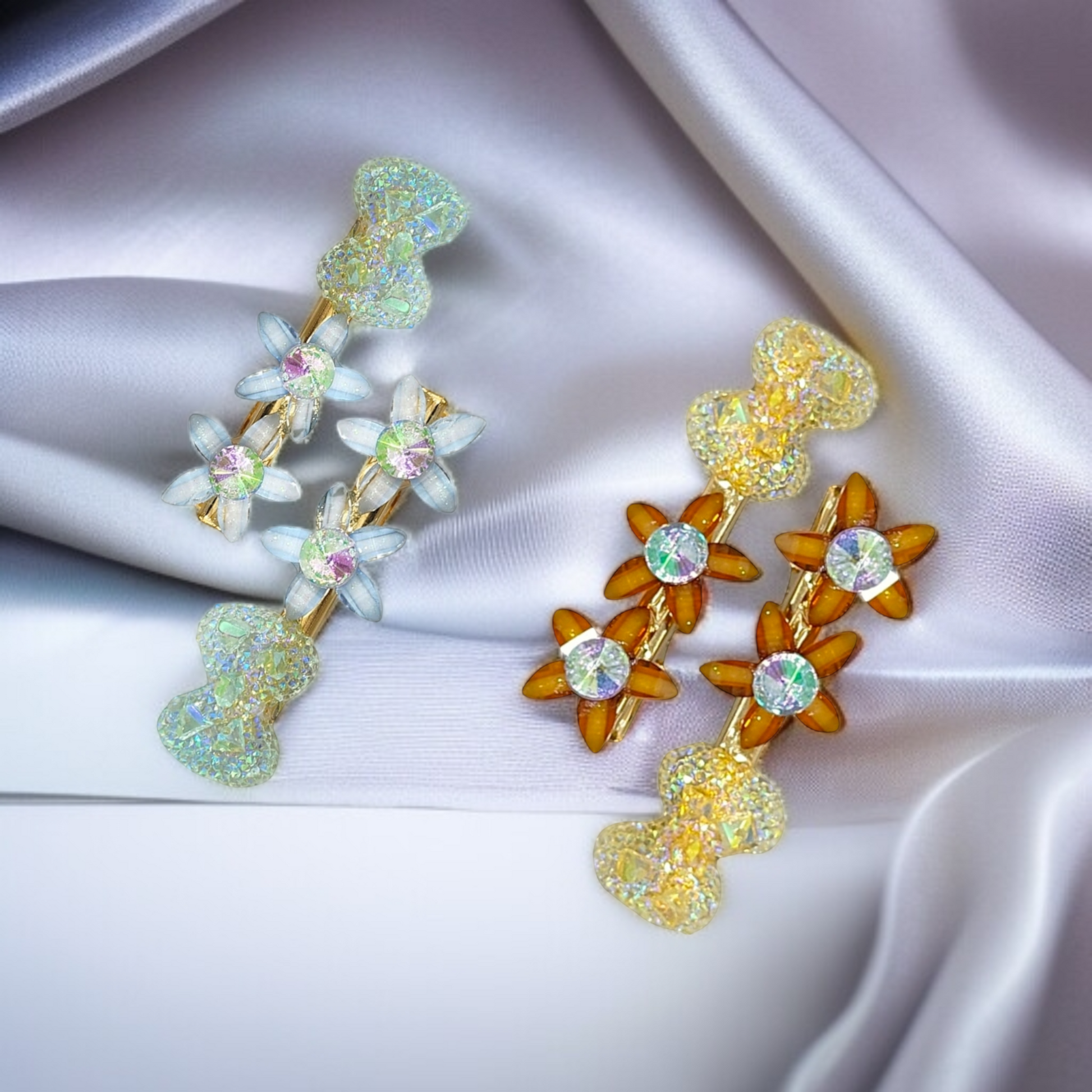 A set of 2 floral-inspired clips in cheerful yellow and soft green . Lightweight, secure, and perfect for adding a playful pop to any hairstyle