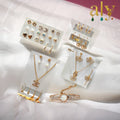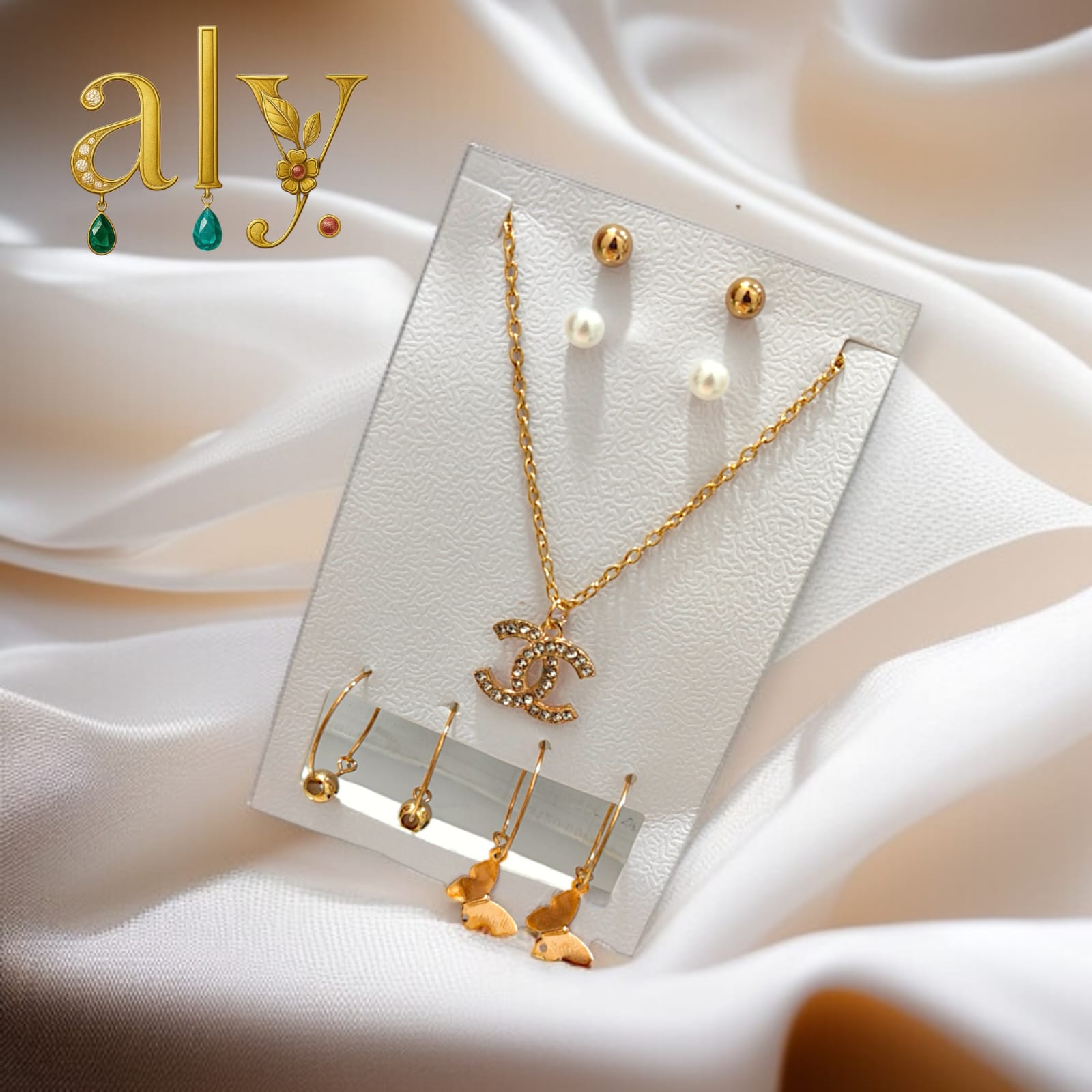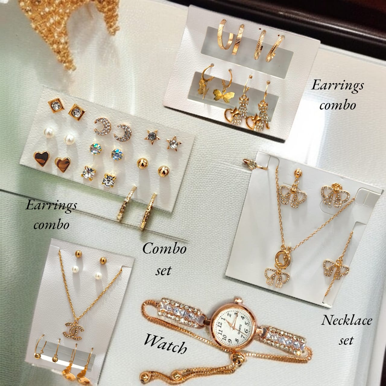 Auragold is a 5-piece gold jewelry combo featuring a watch, necklaces, earrings, and a bracelet — perfect for festive glam or everyday elegance. Lightweight, skin-friendly, and crafted with a lasting golden shine .