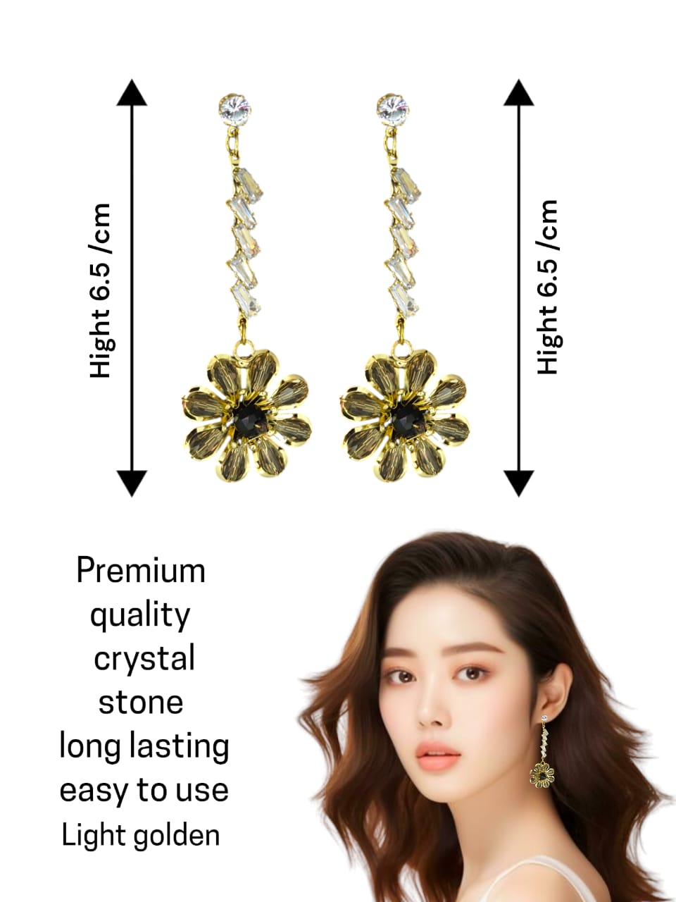 "Delicately crafted, these gold-toned floral drop earrings feature shimmering crystal accents and a bold black centerpiece—perfect for adding a touch of elegance and charm to any outfit."