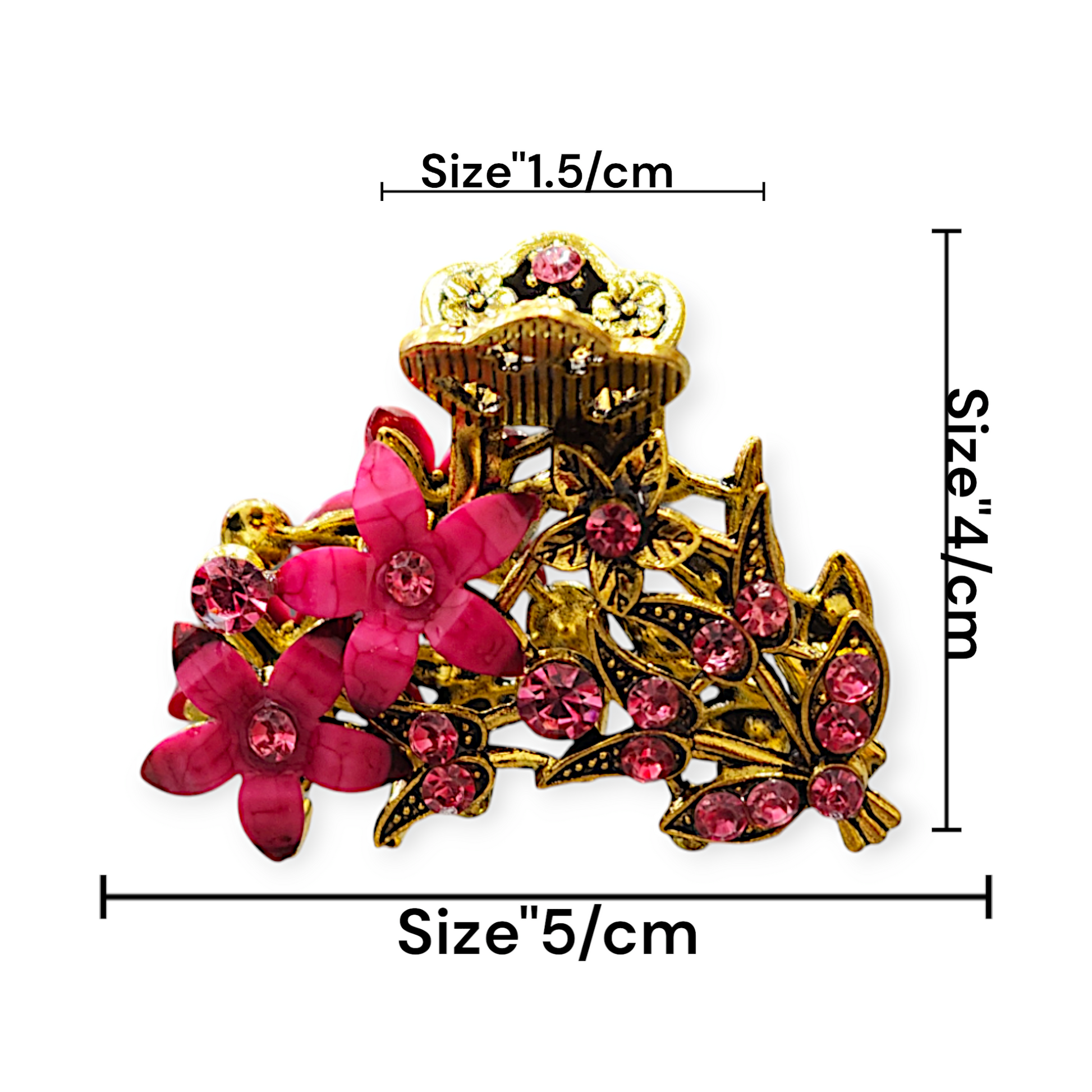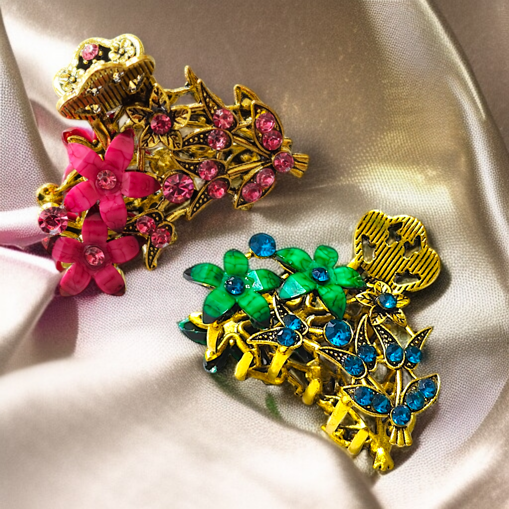 Bloomé Gold is a golden floral claw clip adorned with sparkling jewels—elegant, secure, and perfect for effortless everyday glam or special occasions