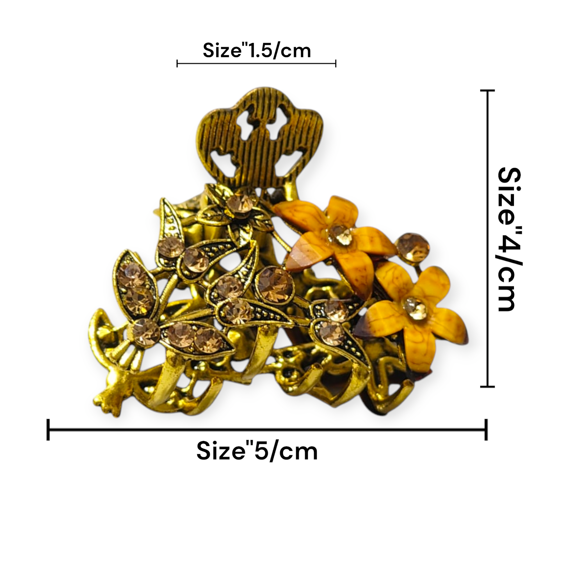 Bloomé Gold is a golden floral claw clip adorned with sparkling jewels—elegant, secure, and perfect for effortless everyday glam or special occasions .