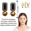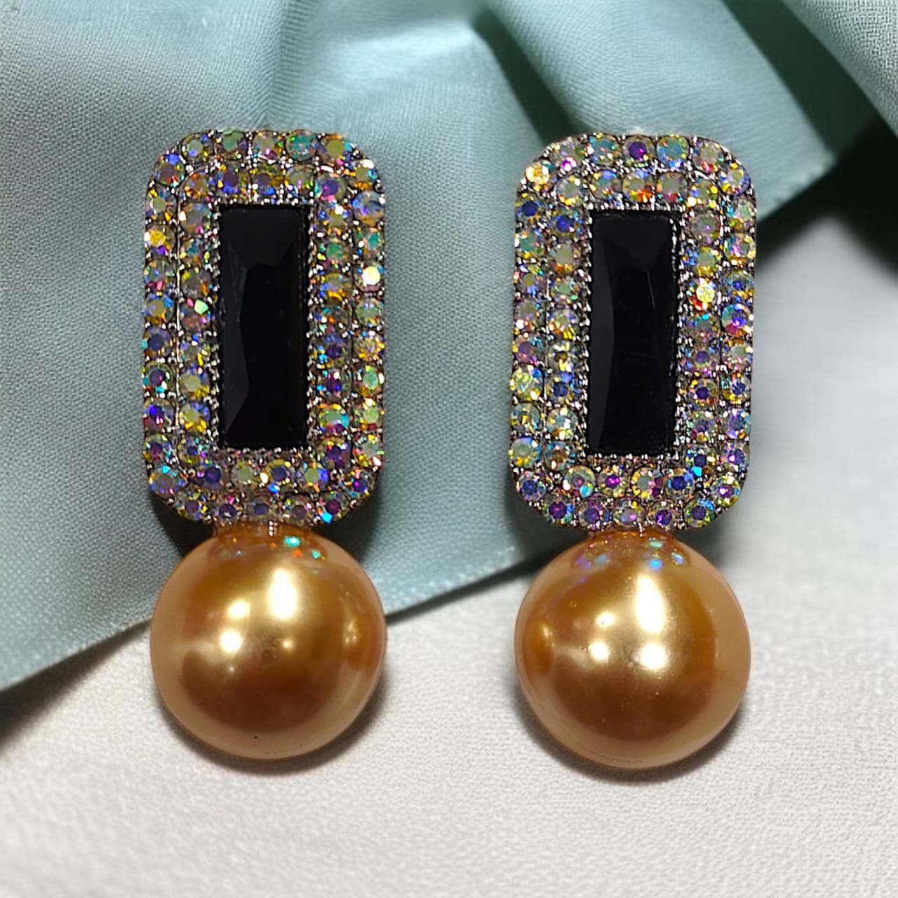 Turn heads with these luxurious statement earrings, featuring a bold rectangular black gemstone set in a bed of dazzling multicolor crystals. Finished with a radiant golden South Sea-style pearl drop, these earrings blend timeless elegance with a touch of glamour. Perfect for formal events, weddings, or upscale soirées, they add an eye-catching sparkle and sophistication to any outfit.