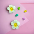 Two Plumeria flowers and four small decorative elements. Plumeria flowers, also known as Frangipani, are known for their beauty and fragrance and are used for various purposes. Pack of 2.
