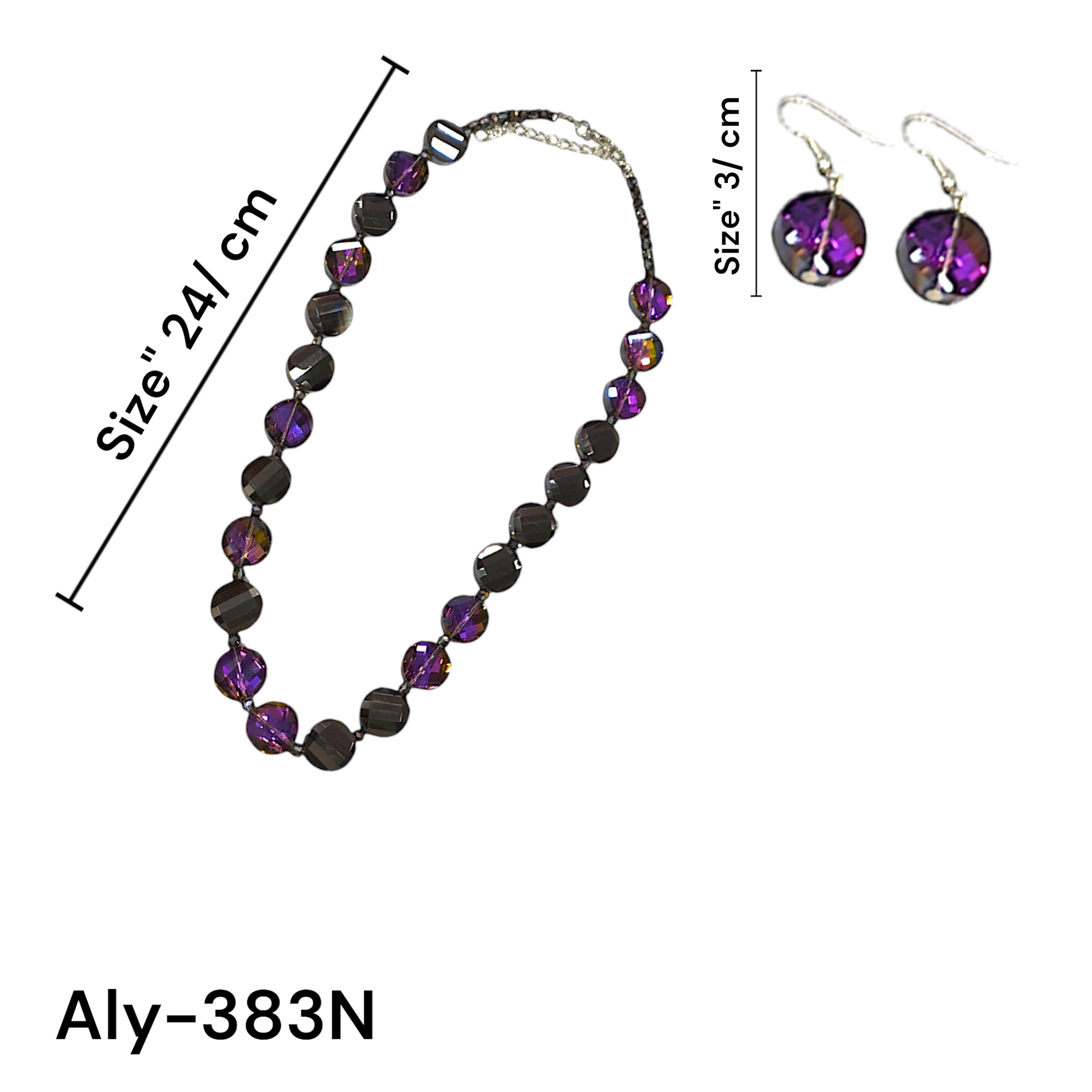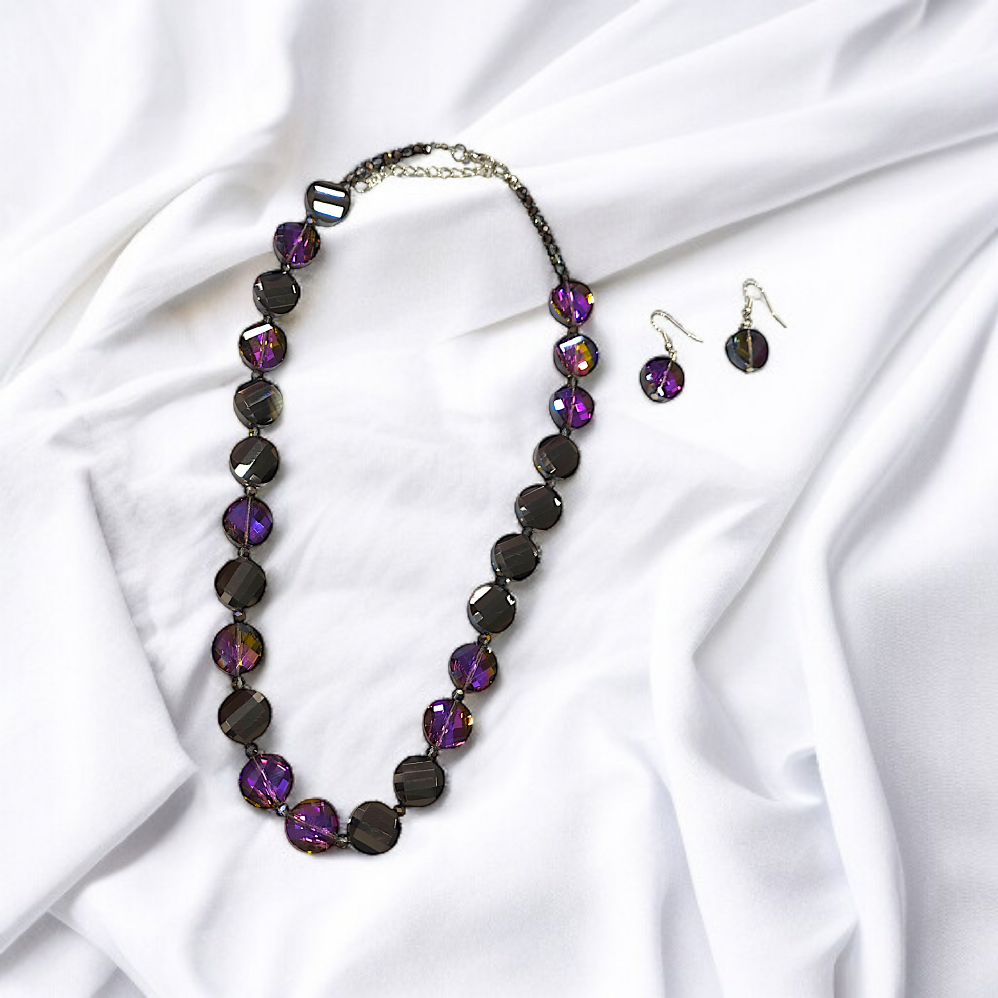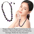 A crystal necklace and earring duo in smoky gray and amethyst purple, finished with a dark chain and sleek hooks—bold, modern, and effortlessly stylish.