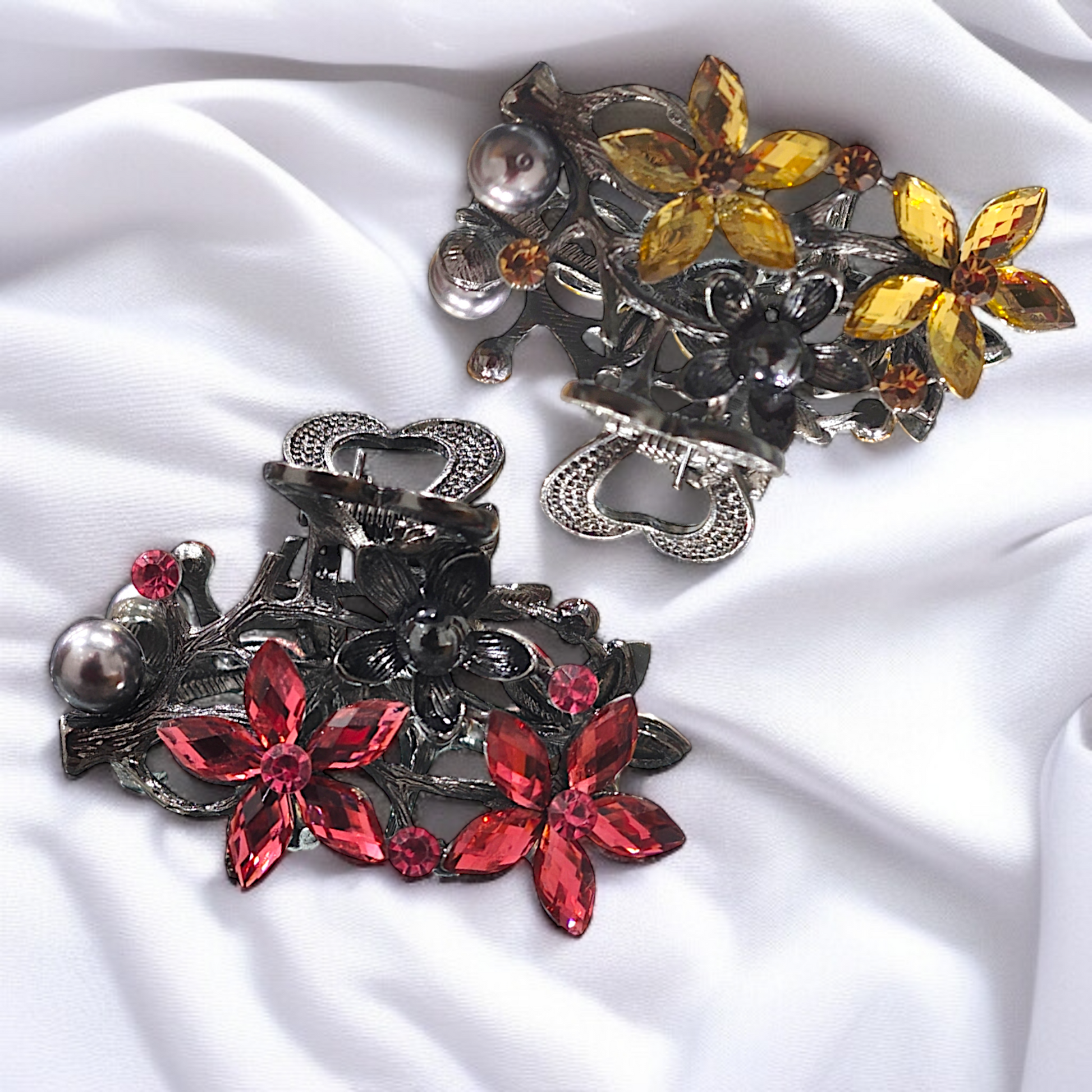 BloomBlack is a set of 2 vintage-inspired black hair claws, designed to bring luxurious charm and timeless elegance to any look .