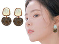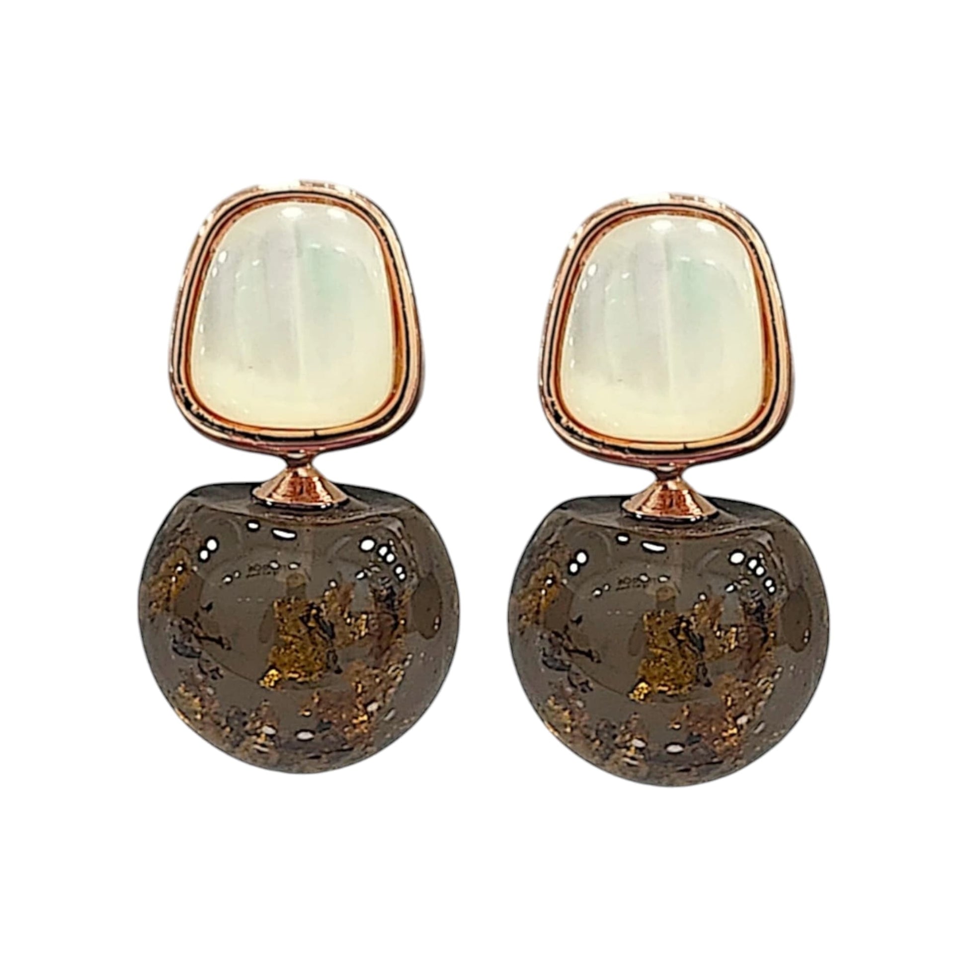 These earrings feature a square, iridescent white stone or material, possibly mother-of-pearl or a similar substance, set in a rose gold-toned frame.