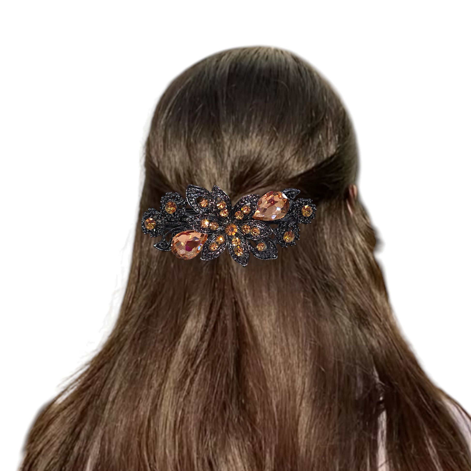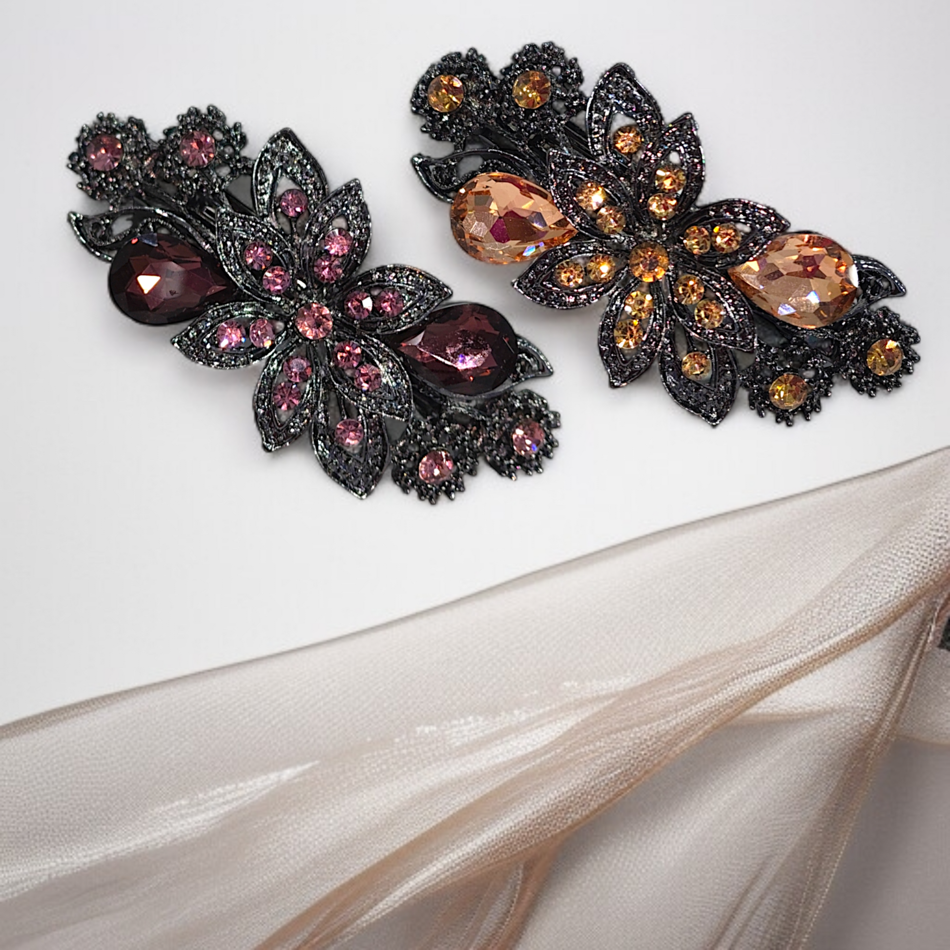 Bloomora Gems is a set of 2 antique-style hair clips with intricate floral and leafy designs in a dark gunmetal finish—elegant, sturdy, and timeless